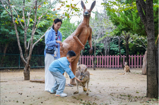 除了精彩纷呈的主题活动,园区的动物互动体验在此次庆典中更显魅力。鸵鸟、小矮马与小老虎成为当天最受欢迎的"明星"。游客们在专业饲养员的指导下,与这些可爱动物进行安全互动。性格温顺的小矮马俯首接受孩子们的抚摸,高大的鸵鸟好奇地啄食游客手中的特制饲料,而萌态可掬的小老虎更是引得游客纷纷驻足拍照。