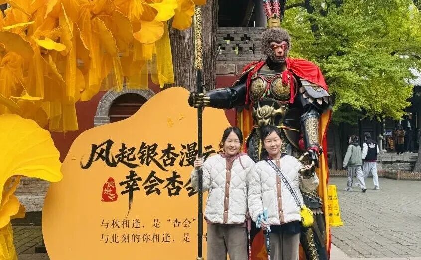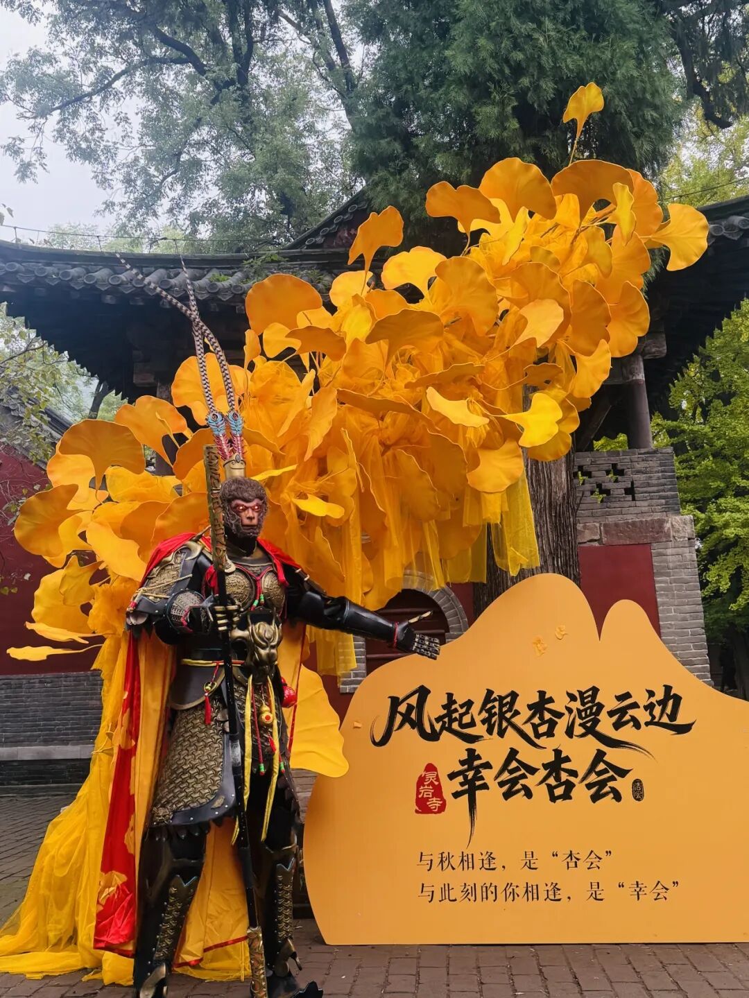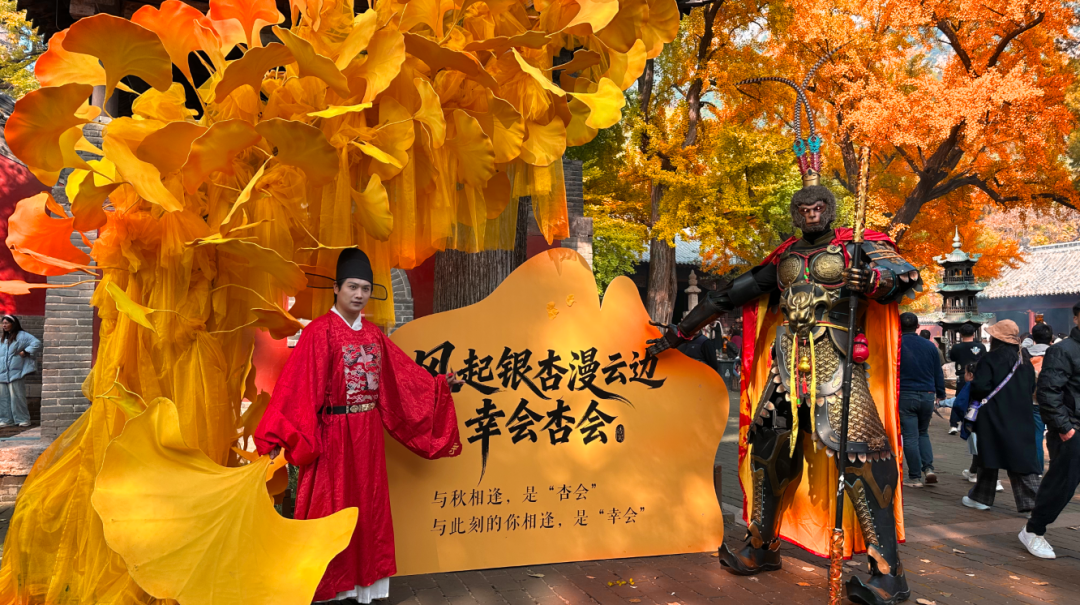 风起银杏漫云边,灵岩寺景区藏了一场千年“杏会”。巨型悟空披金甲降临、苏轼落子待君至。千年银杏最佳观赏期已至,只差一个踏入山门的你。