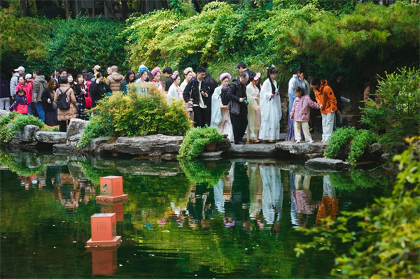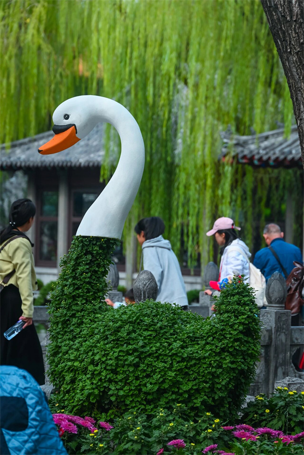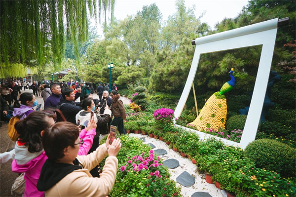 东区以“文脉流芳·菊绘新篇”为主题,精心打造的菊花小景与园林廊榭相得益彰,传统造园技艺在这里被赋予了新的生命。龟石广场的菊花小景《引菊入画》,缀以数百支乒乓菊扎制而成的灵动孔雀,勾勒出一幅可赏可品、可感秋意的风情画卷,吸引众多游客驻足观赏,拍照留念。