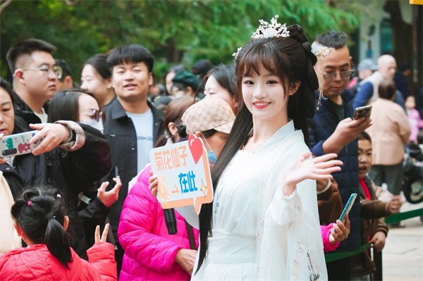 菊展开幕当日,衣袂翩翩的菊花仙子以灵动舞姿出场,带领游客沿最佳观赏路线打卡菊展,共同开启今秋的诗意时光。“济南二安”NPC与现场观众品菊对诗,将欢乐气氛推向高潮,诗词的韵律与流动的菊香相得益彰,再现了一场穿越时空的诗词雅集。