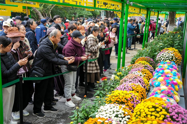 色彩绚烂的炫彩菊一经亮相便成为菊展焦点,吸引赏菊爱好者纷纷围观,惊叹声、快门声不绝于耳。“一开始以为是假花,太惊艳了,没想到真花也能这么漂亮,咱们趵突泉的菊展越来越时尚了!”不少市民游客发出感叹。