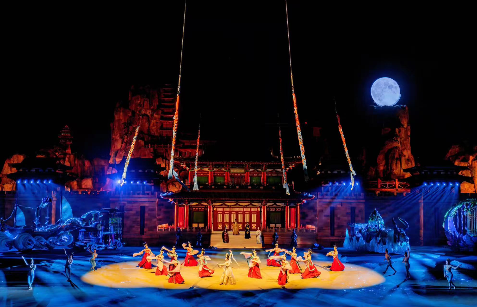 提升审美价值,用视听矩阵陈列出一场宏大的美学盛宴。据景区相关负责人剧透,该剧目以大唐中后期历史事件为故事主线,讲述琅琊颜氏家族在乱世中的坚守与牺牲,生动诠释中华民族公忠体国、自强不息的人文品格。演出阵容堪称豪华,由150余名专业演员倾力演绎,同步融入上百匹马、骆驼、渡鸦及捷克狼犬等动物,搭配千余台灯光与舞美道具,构建出多维立体的视听矩阵。值得一提的是,剧场设置全国首创环场跑马赛道,融合马道、水中、山体、环城四大特色跑法,巍峨城墙与两侧箭楼构就完整环形跑道,山体外侧特设升降 LED 屏,火山喷发、流水奔涌、烟火璀璨等特效轮番上演,为观众带来强烈感官冲击。其专属秀场可容纳约4200名观众同时观演,多项创意设计创下全国行业先例。