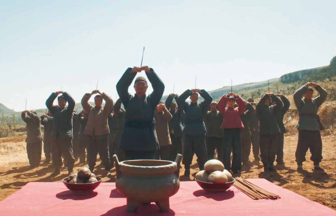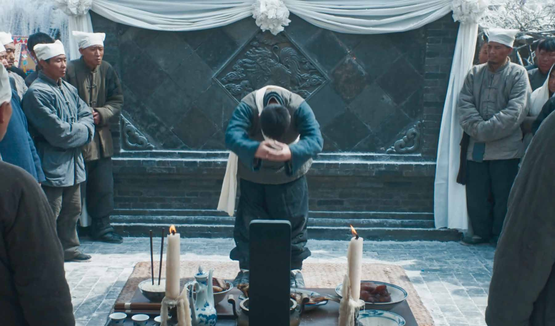 剧中多次出现空间性仪式,如试春气、踅谷仓、开镰仪式等。这些仪式对于剧情发展本身并无推动作用,却因其所具有的强烈象征色彩,使空间成为真正的记忆之场。如剧中开镰仪式场景,所有村民肃穆列队,面朝田野下跪叩首,向大地致敬。随后,封大脚手持镰刀燃香“点镰”,众人齐声吟唱“颗粒归仓慰儿娘”。这一仪式融合了敬天、敬地、敬祖的传统信仰。其所强化的是人与土地之间超功利的链接。类似的,还有剧中呈现的送葬仪式。在宁秀秀的母亲病逝后,村中设立灵棚,白纸扎花、唢呐悲鸣,村民们身着孝衣、披麻戴孝,分辈分依次跪拜焚香。这些场面将民俗纳入剧中人物日常生活逻辑中,让仪式成为记忆生成的一部分。