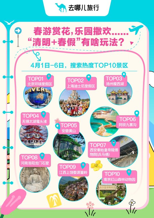 此外,主题乐园是这个清明的绝对C位。去哪儿数据显示,平台主题乐园搜索热度增长1倍。北京环球度假区、上海迪士尼度假区稳居全国景区热度前列;沉浸式中式主题乐园热度高,西安《长恨歌》演出景区、太湖演艺城、开封清明上河园、芜湖方特东方神画乐园等,依托特色国风场景和沉浸式体验预计将吸引大批游客。