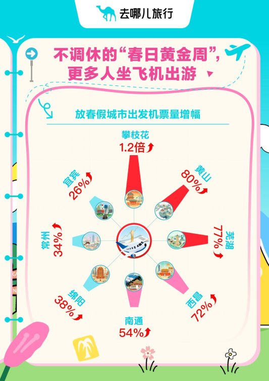 去哪儿旅行数据显示,4月1日-6日,热门城市乘飞机出游乘客显著增加。从增速来看,春假对地方客源输出的拉动效应非常显著,全国出发机票量增速TOP20城市中,有超过一半都是放春假的城市。其中,攀枝花出发机票量增长超1.2倍,黄山增80%,西昌增长72%。