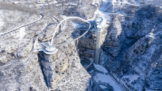 冰瀑像一条白色巨龙从山壁间奔腾而下,在阳光下晶莹剔透,闪烁着迷人的光泽,与周围的雪景相互映衬,构成一片洁白的冰雪世界。