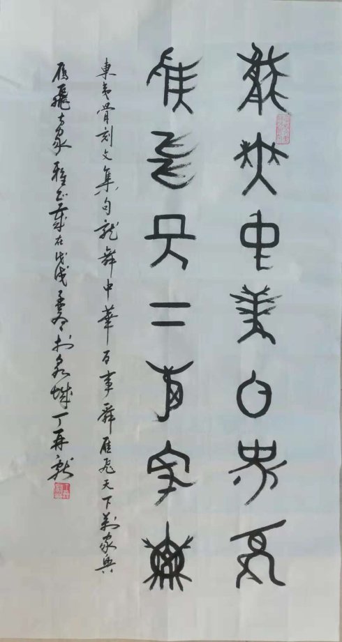 笔者为刘雁飞东夷骨刻文集句:龙舞中华百事舜,雁飞天下万家兴。(丁再献)