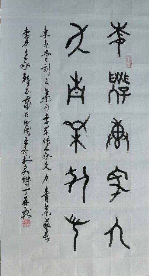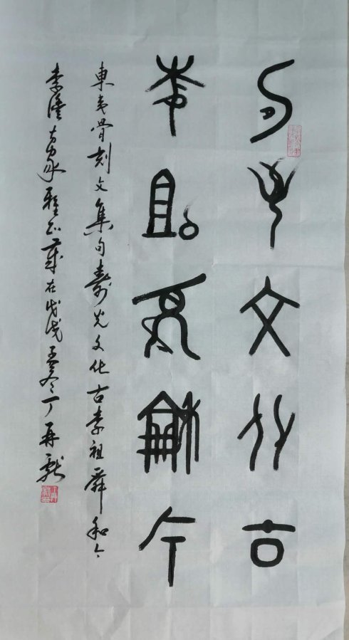 这是2018年4月10日,我曾写的题李沣先生回故乡成为“北海书院历史文化讲座”的开讲人、讲述寿光人文讲历史,闻讯而急就诗一首。今天猛然想起李沣老请我为先生和女儿各写一幅东夷骨刻文书法作品,但一直没有兑现,遂展纸提笔书写了东夷骨刻文集句:“寿光文化古,李祖舜和今”;为其女儿李力书写了“李学传家久,力青集艺长”为记。