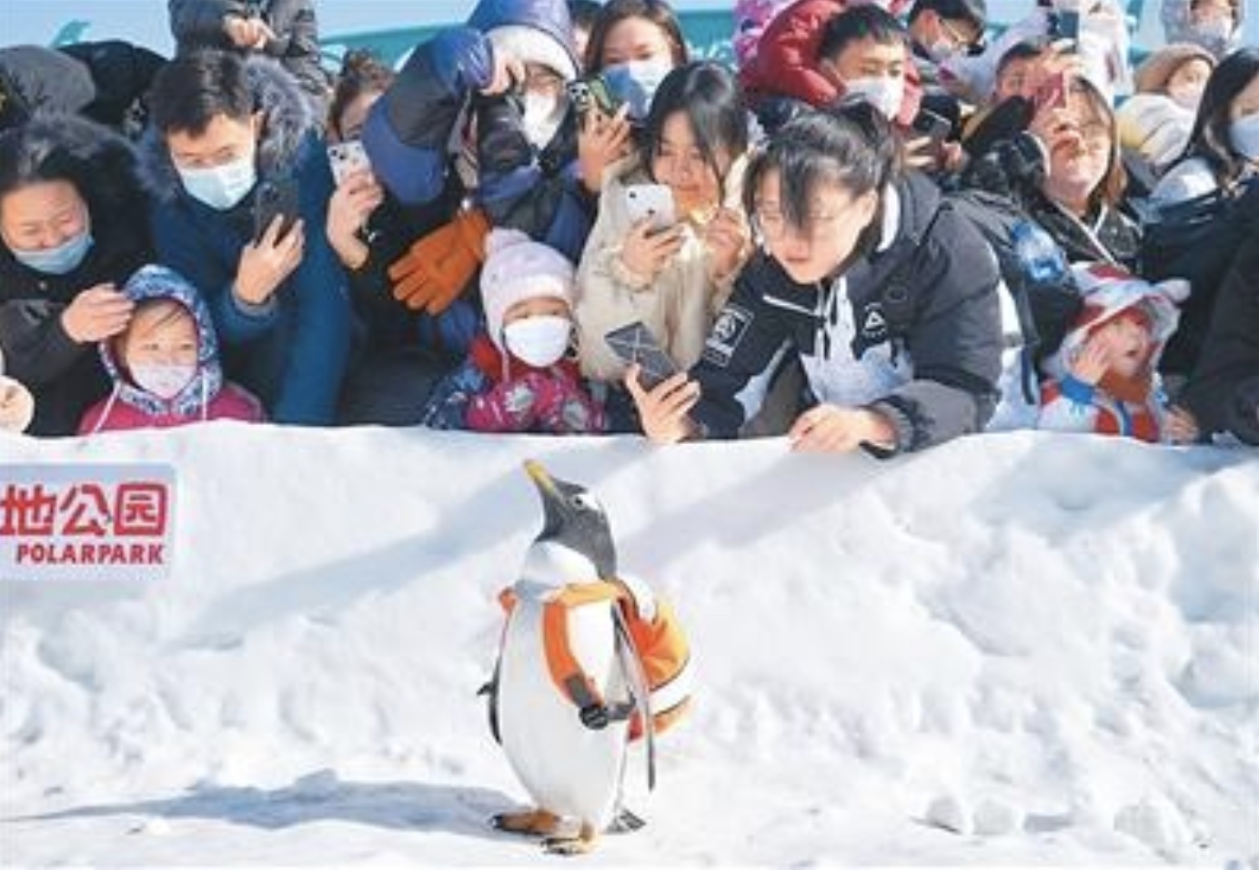 11月15日,哈尔滨极地公园开启首场“淘学企鹅冰雪巡游”,在哈尔滨极地公园极地广场免费向公众开放。