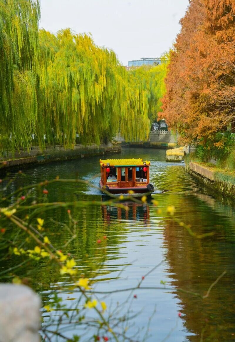 初冬的护城河两岸仍旧垂柳依依,青青柳色让初到济南的游客感到惊讶。众泉汇流而成的护城河明澈清盈,无论冬夏,始终以清浅碧绿示人,水草在阳光下泛着如玉光泽,像流淌着的玛瑙翡翠一般。