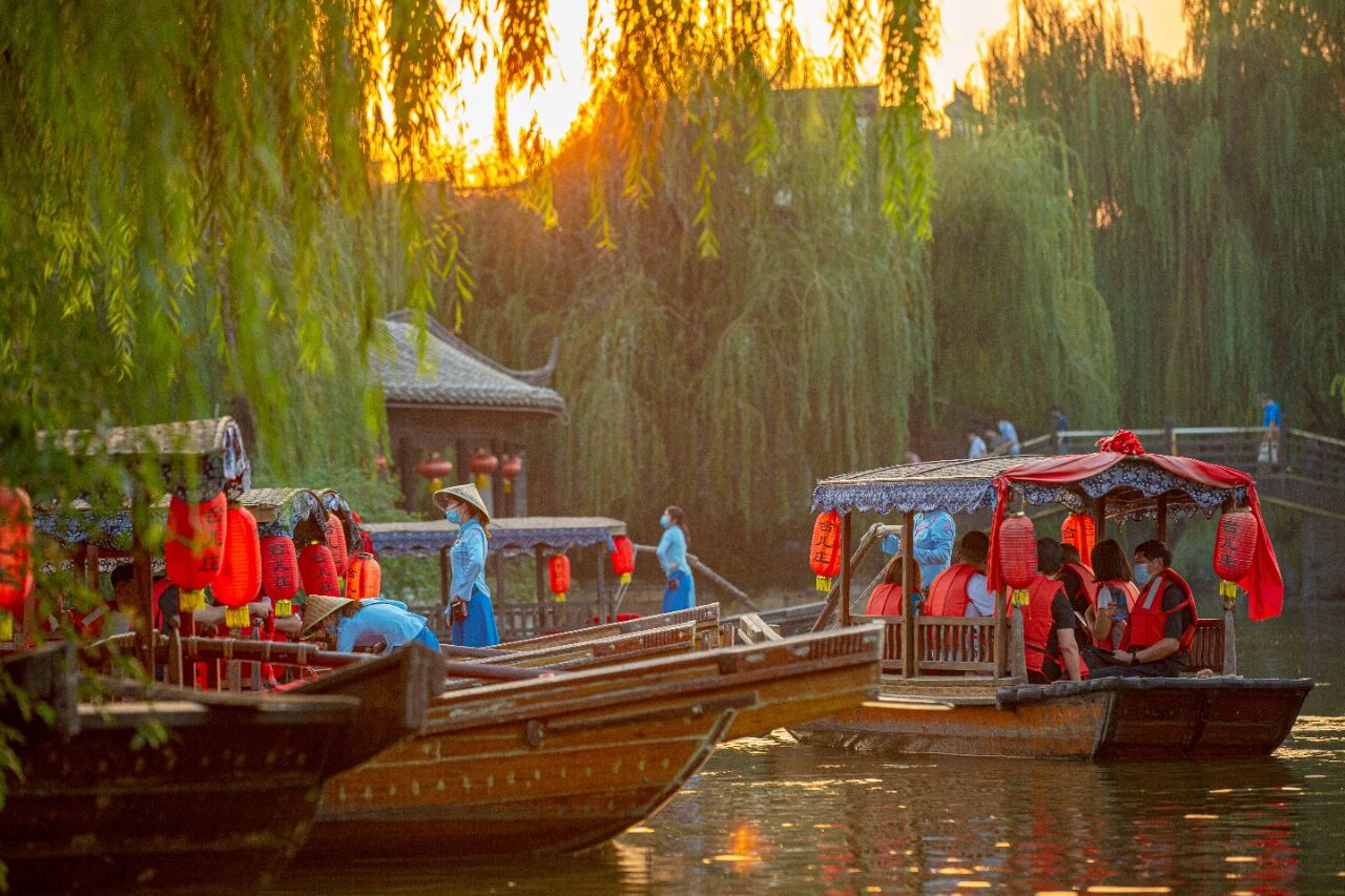 待到暮色四合,红灯笼次第亮起时,灯光透过菊瓣洒下斑驳的影,古建的飞檐若隐若现,恍若穿越千年的梦境。此时若乘上摇橹船夜游运河,看两岸的菊花在灯影里摇曳,听船桨划水的声响与远处的古筝声交织,便会懂为何古人说“秋菊有佳色,裛露掇其英”,这份在古城里独有的 “菊夜风情”,是国庆最值得珍藏的浪漫。