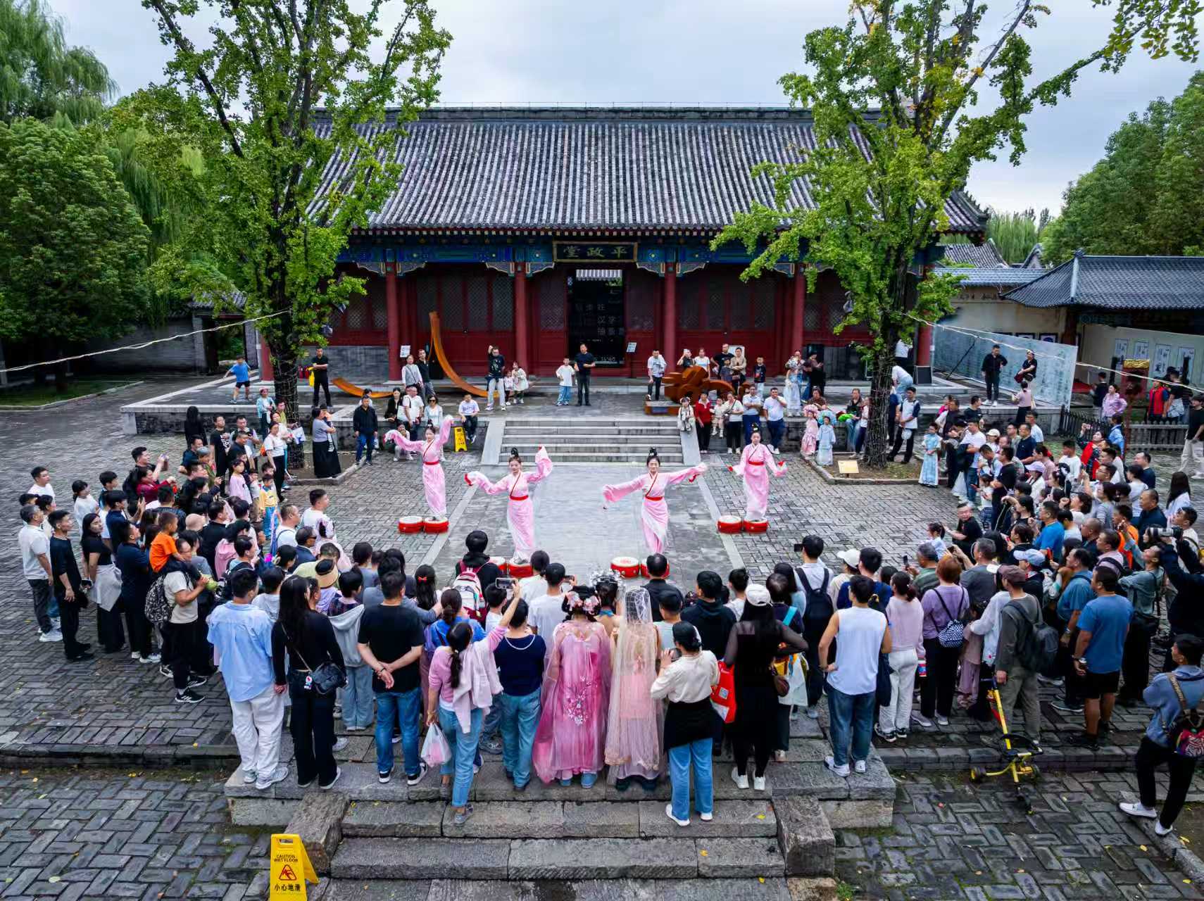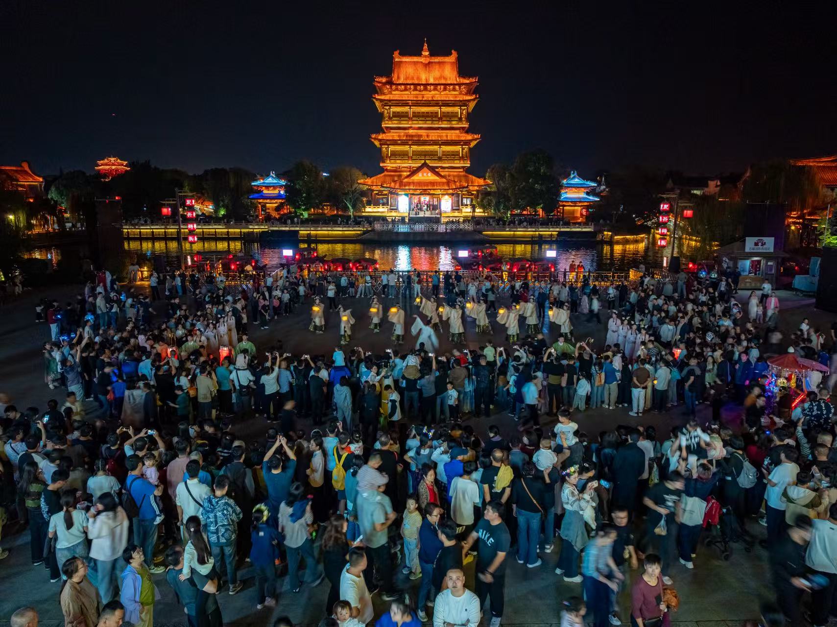 常态化演艺中,从早九点到晚九点多,百余场次的演艺轮番上演,演艺题材也从鲁南非遗到传统杂技、歌曲舞蹈、器乐民俗等。值得一提的是,国庆中秋双节期间,台儿庄古城开设了主题节目、沉浸式互动演艺等特色演艺。在牛市汪南汪,一场与月亮对话的舞蹈曾上演。舞者宛如月宫仙子,于水面上的舞台翩跹起舞,每一个旋转、每一次跳跃,都与天边的明月、水中的倒影、漂浮的莲灯交织共鸣,演绎出一场空灵绝尘的“水下升明月”之景。此外,才子佳人、衣袂飘飘,环佩叮咚,汉服NPC们从画中走出,与游人擦肩、互动,将盛世的典雅弥漫在古城的每一条街巷。转进丁字街,身着民国服饰的舞者们,伴着留声机里流淌的老歌,演绎着一段优雅又带着忧伤的情景剧。剧目角色散落着的风情万种,为古城的夜增添了一抹复古暖色。
