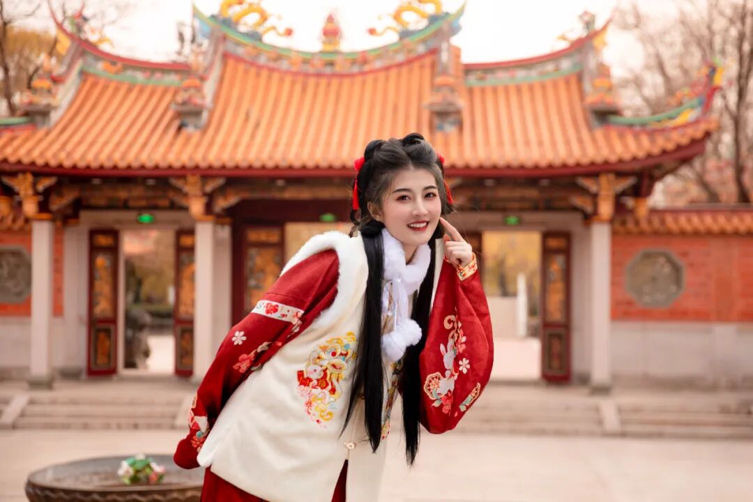 飞檐翘起,如凤展翼;朱红列柱,映得袖口织金愈发明艳。执团扇半遮面,于缭绕香火里轻许心愿——海风穿过古运河,掀起妈祖殿角的铜铃,也掀起曳地的披帛。那一刻,神明与少女,同被写进红砖黛瓦的温柔里。