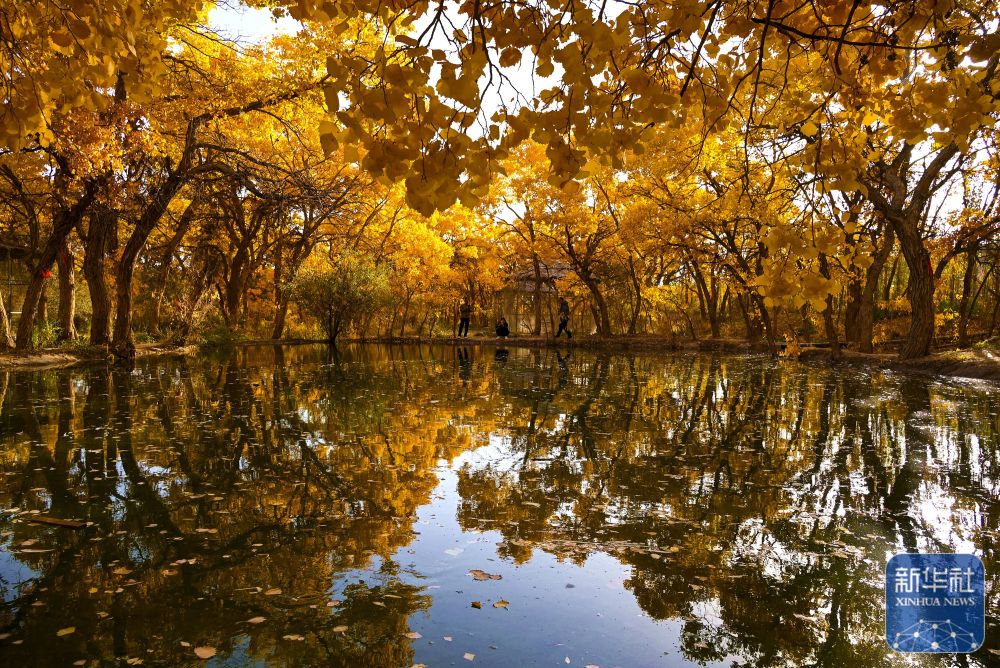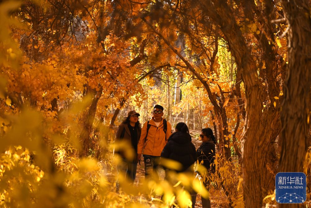 ↑ 10月19日,游客在甘肃省敦煌市莫高镇的胡杨林中游览。新华社发(张晓亮 摄)