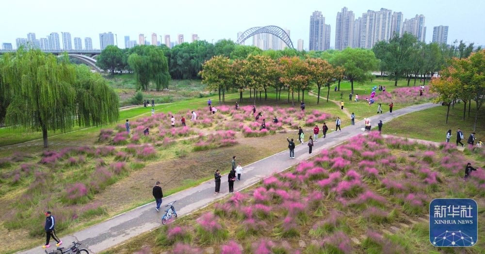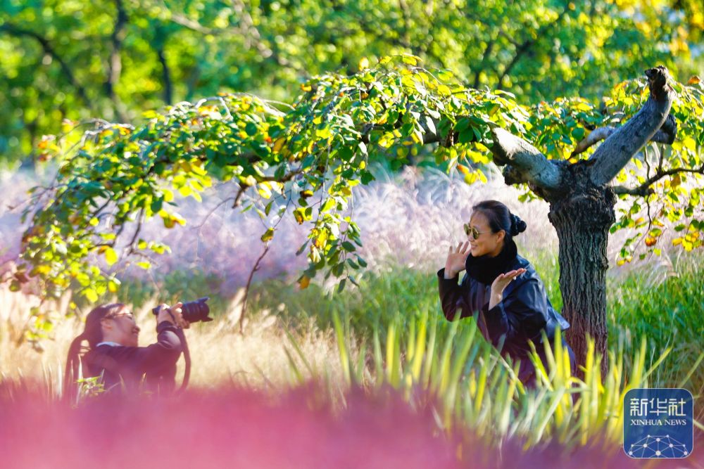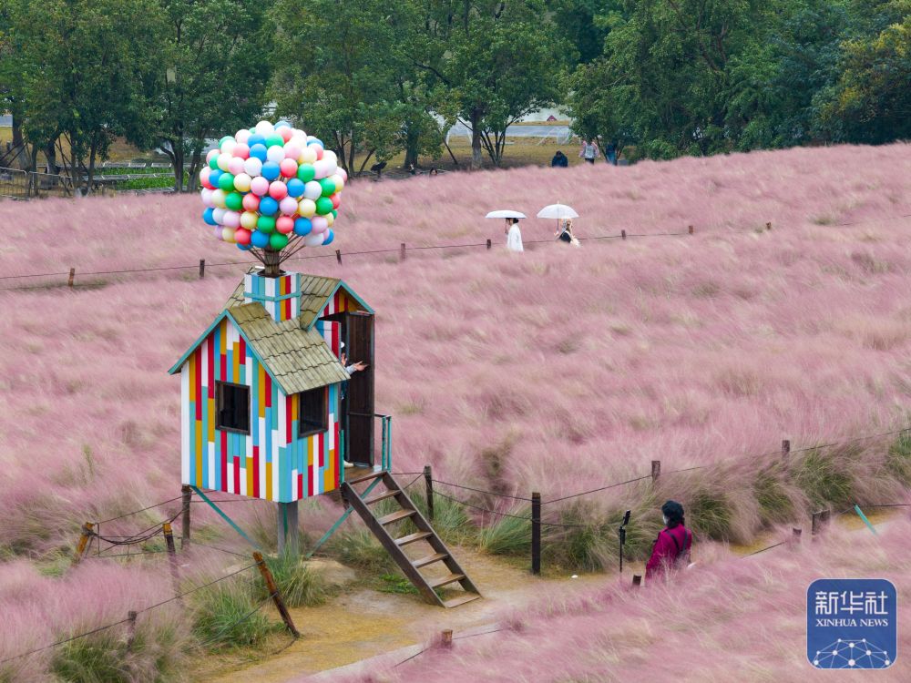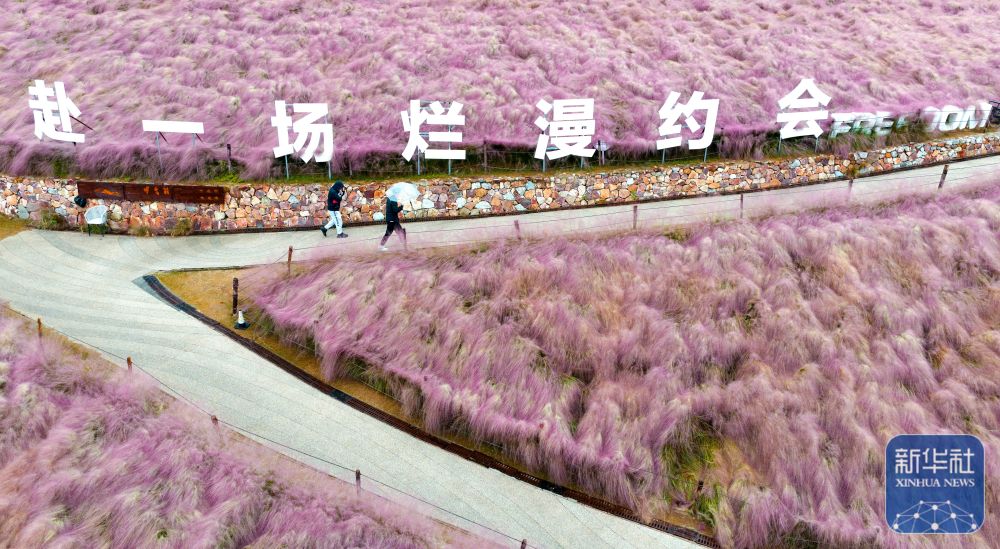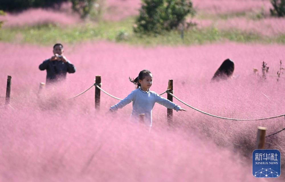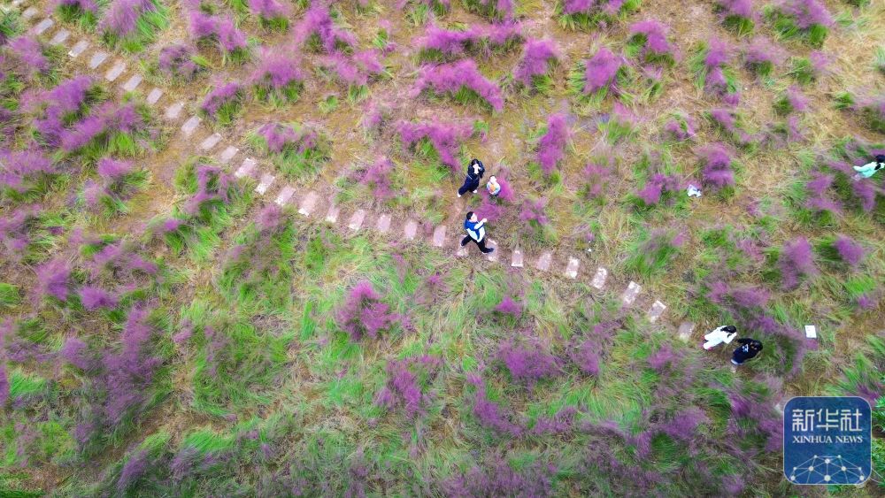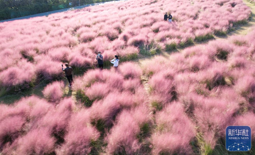 ↑ 10月19日,在山东省临沂市沂南县卧龙山公园,游客在粉黛乱子草中打卡拍照(无人机照片)。新华社发(王彦冰 摄)