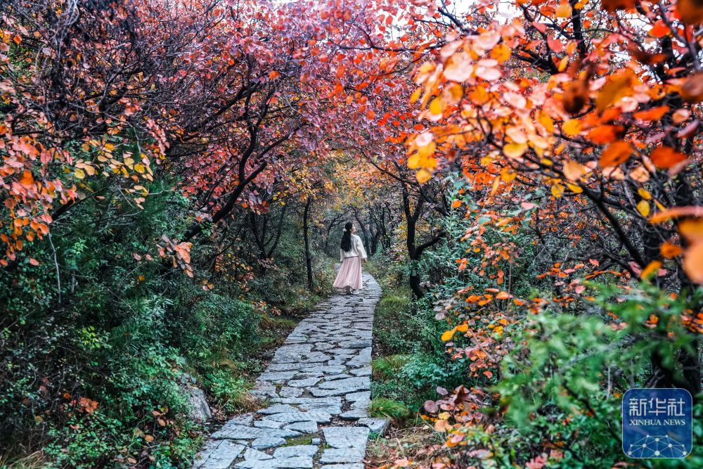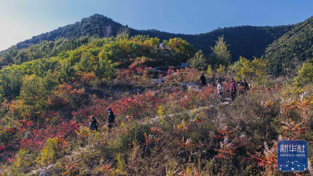 ↑ 10月19日,游客在河北省遵化市南山常乐谷景区赏景游玩(无人机照片)。新华社发(刘满仓 摄)