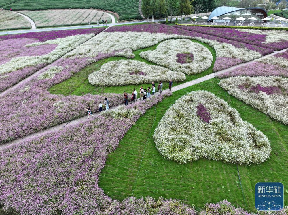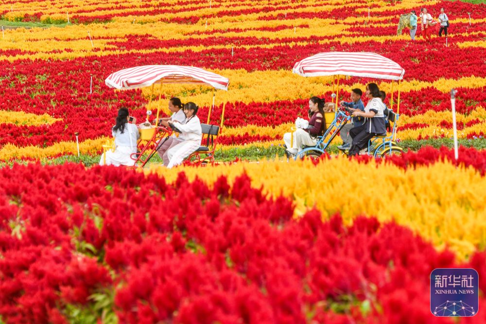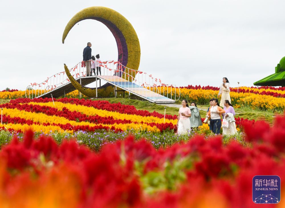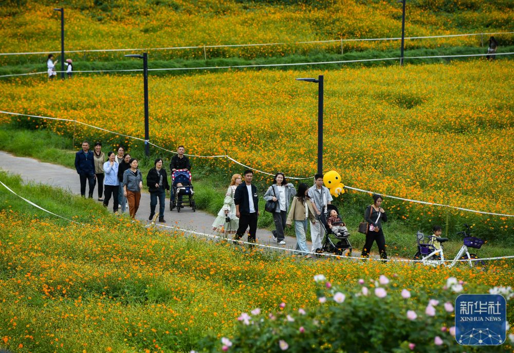 ↑ 10月19日,游客在广西富川瑶族自治县神仙湖慢城花海景区游玩。新华社发(蒋克青摄)