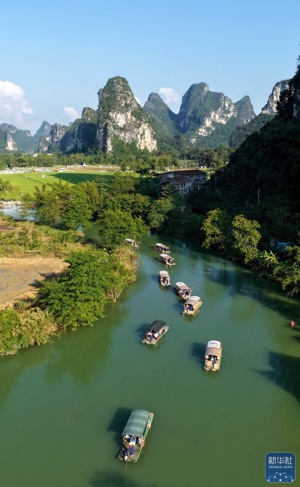↑ 10月18日,在广西崇左市大新县堪圩乡明仕旅游度假区,游客乘坐竹筏在稻田边的明仕河上游玩。新华社发(黎寒池 摄)