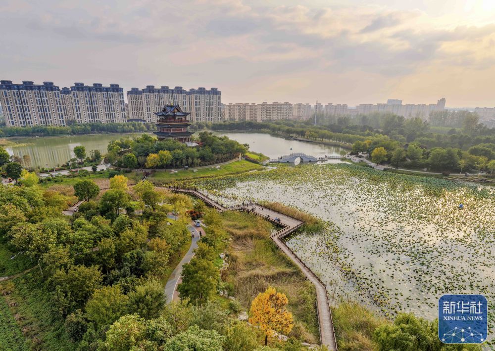 ↑ 10月18日,人们在河南省商丘市睢县凤仪湖景区游览(无人机照片)。新华社发(徐泽源摄)