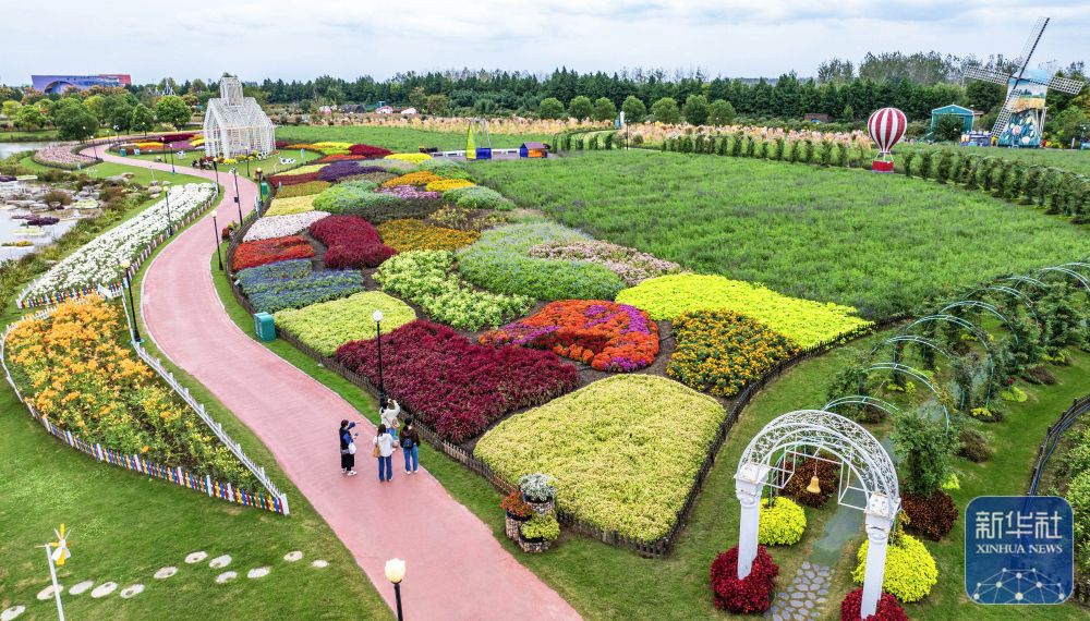 ↑ 10月19日,游客在江苏省盐城市大丰区荷兰花海景区内赏花游玩(无人机照片)。新华社发(周社根 摄)