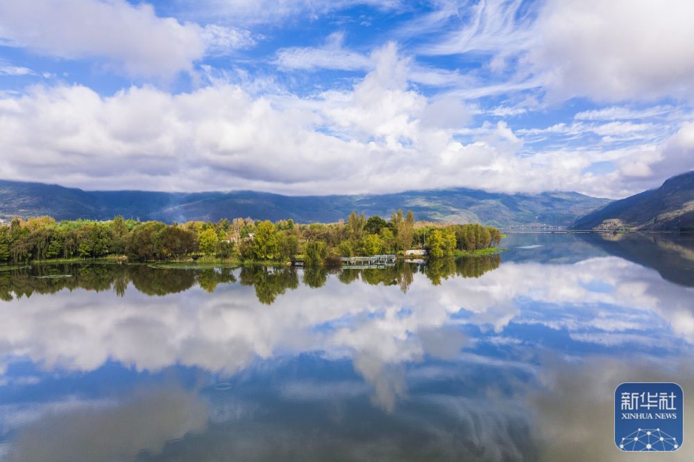 ↑ 这是10月18日拍摄的云南省大理白族自治州洱源县茈碧湖(无人机照片)。新华社发(罗新才 摄)