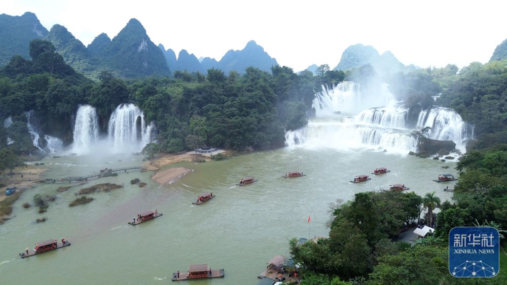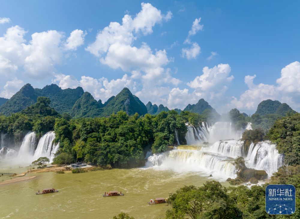 ↑ 10月18日,在广西崇左市大新县中越德天(板约)瀑布跨境旅游合作区,游人乘坐竹筏游览(无人机照片)。新华社发(龙涛摄)