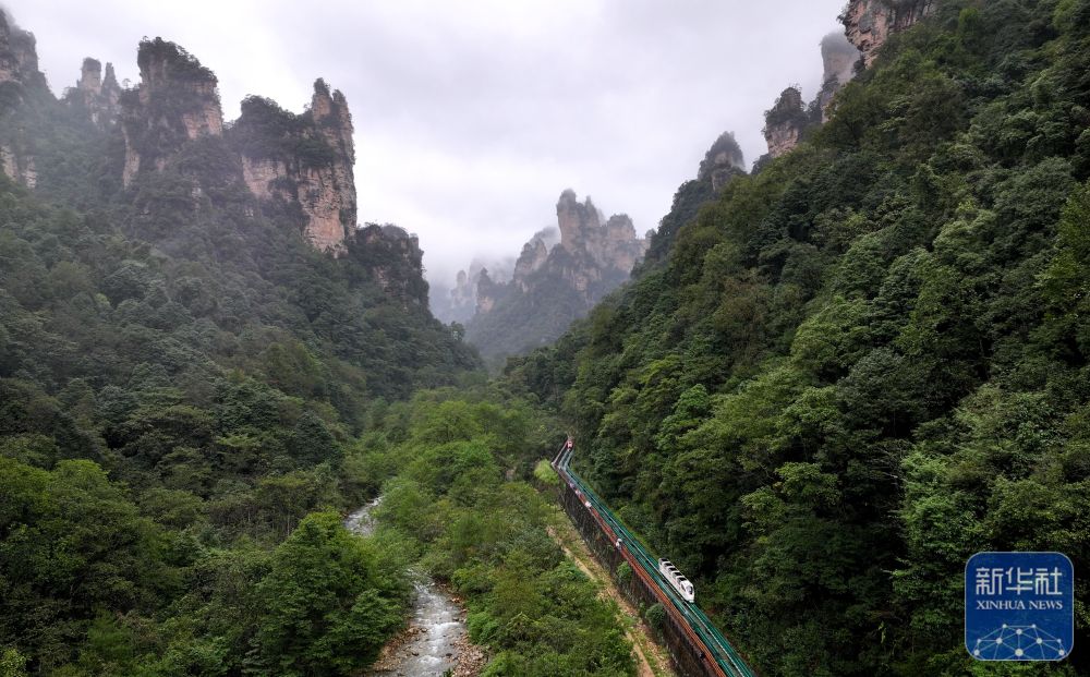 ↑ 10月19日,游人乘观光电车在湖南张家界国家森林公园十里画廊游览(无人机照片)。新华社发(吴勇兵摄)