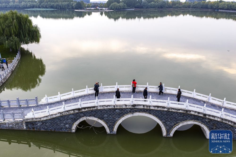 ↑ 10月18日,人们在河南省洛阳市瀛洲桥湿地公园内游览(无人机照片)。新华社发(黄政伟摄)