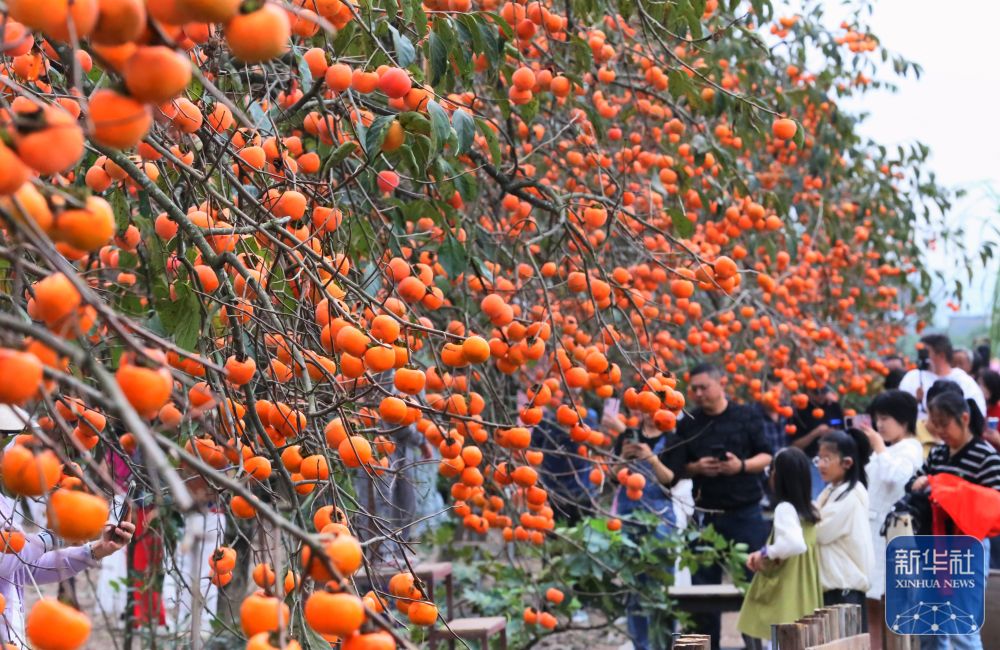 ↑ 10月19日,市民和游客在四川省乐山市五通桥区汤家坝村观赏柿子树。新华社发(李华时摄)