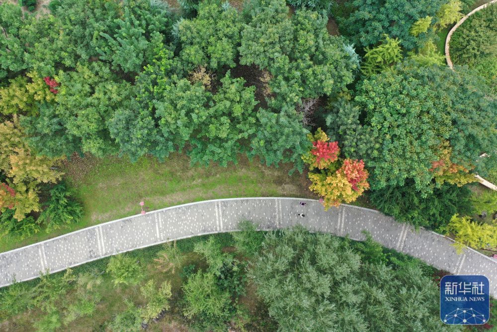 ↑ 10月19日,人们在河南省焦作市温县子夏公园休闲健身(无人机照片)。新华社发(徐宏星摄)