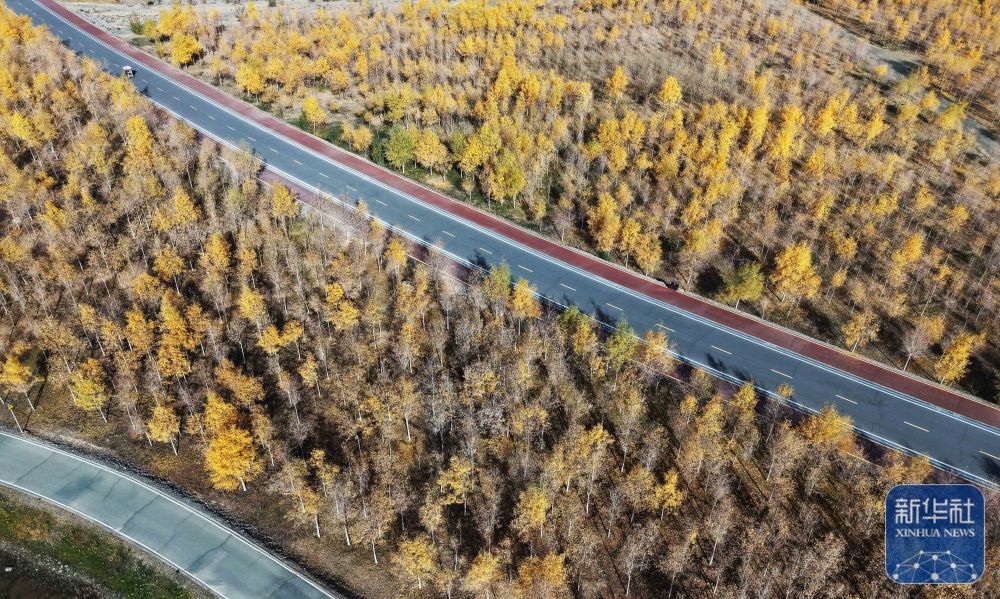 ↑ 这是10月19日拍摄的甘肃省张掖市甘州区黑河林场胡杨林(无人机照片)。新华社发(陈礼 摄)