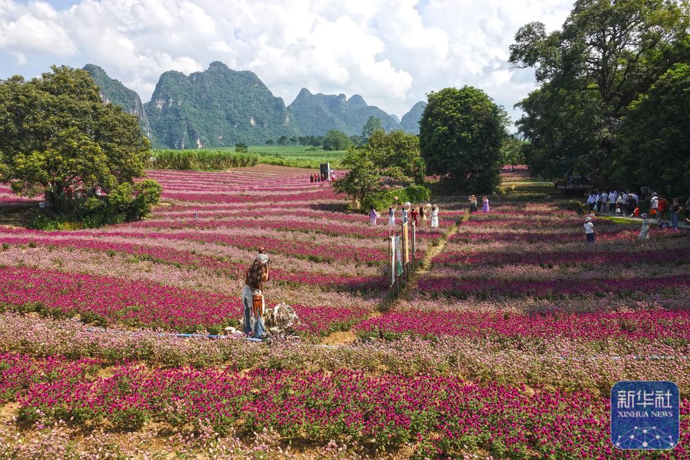 ↑ 10月18日,游人在广西大新县峒那屿湾景区千日红花田赏花游玩。新华社发(喻湘泉 摄)