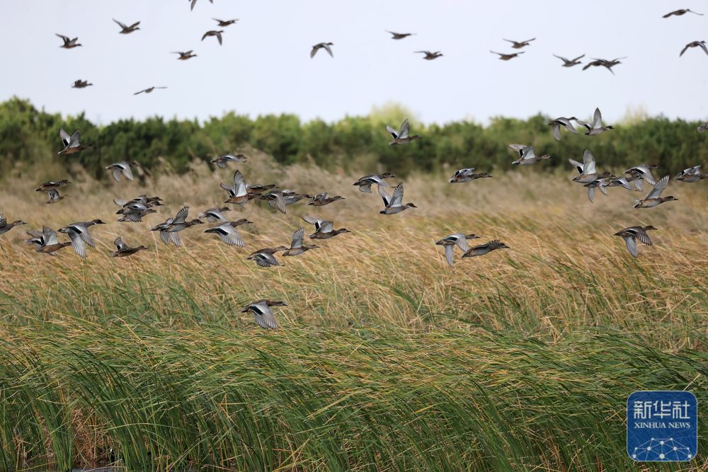 ↑ 10月18日,在山东黄河三角洲国家级自然保护区湿地,候鸟展翅飞翔。新华社发(周广学 摄)