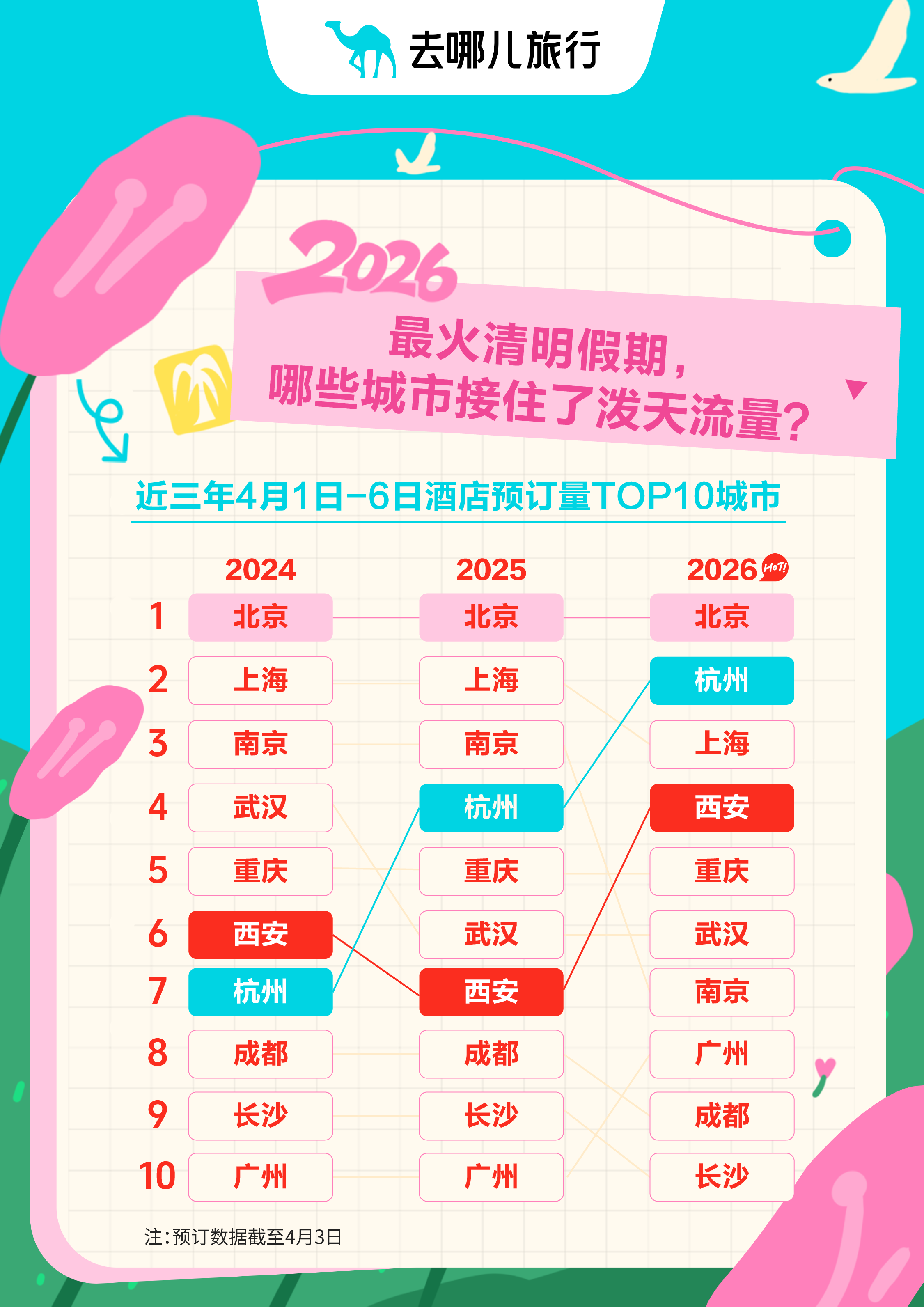 从酒店入住热门城市来看,旅游资源丰富的大城市,以及适合踏春的江南水乡,都是顶流,而北京拔得头筹。截至4月3日,清明假期酒店预订量最高的Top10城市为:北京、杭州、上海、西安、重庆、武汉、南京、广州、成都、长沙。