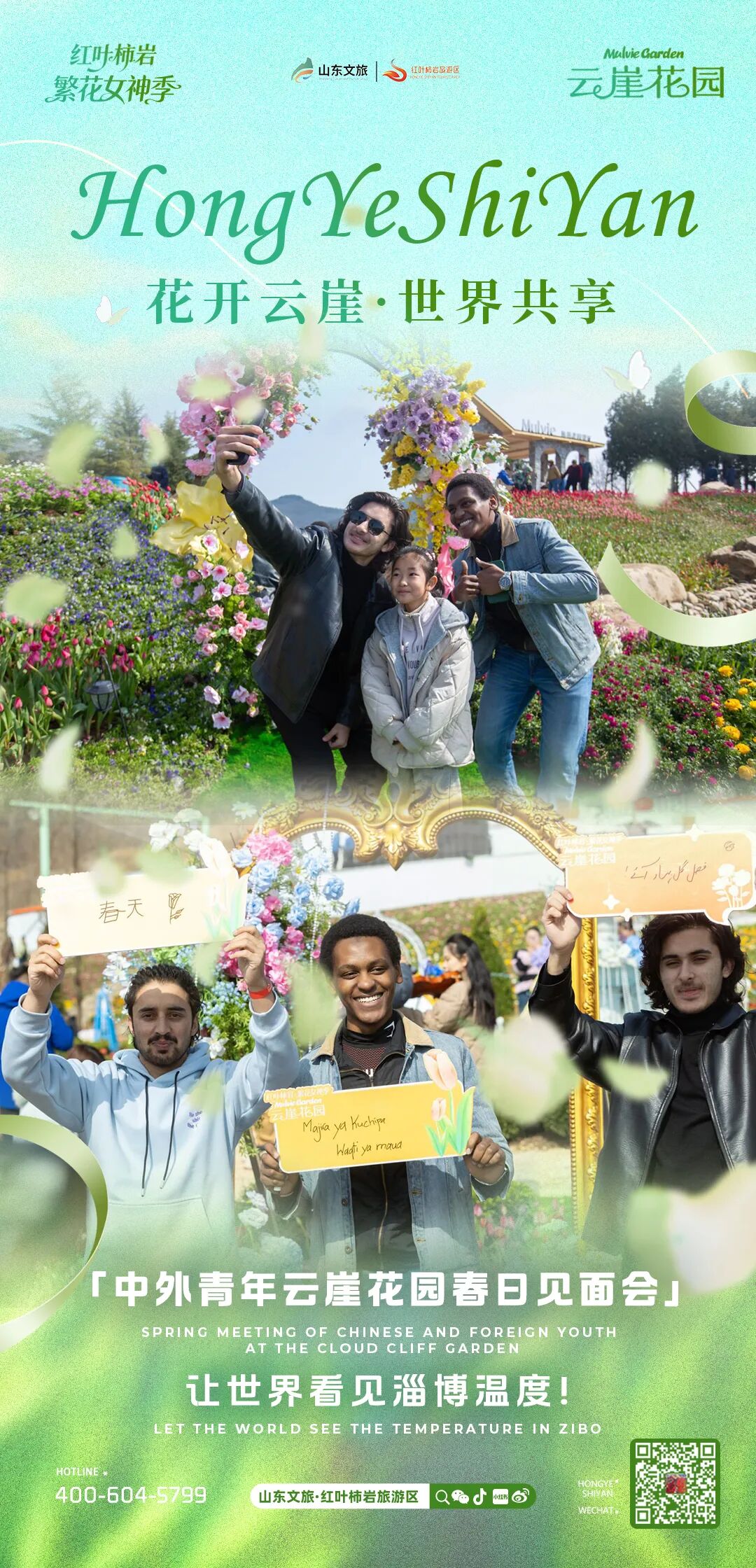 今日的相遇不是一场表演,而是真诚的相遇与自然的融合,不同文化背景的青年在云崖之上共享春风。理解、尊重与联结正在发生,淄博的温度,世界的精彩,在同一片花海里绽放。这个春天,来红叶柿岩「云崖花园」赴一场与春天、与世界的约会。