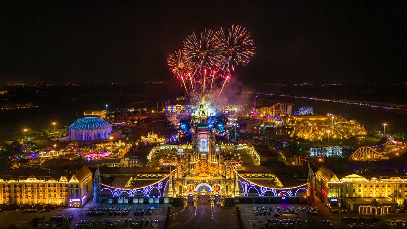 泉城欧乐堡梦幻世界连续七个夜晚,都将呈现“龙腾盛世·奋进中华”主题星空秀和烟花秀。夜幕降临,数百架无人机腾空而起。它们有序地排列出一条气势恢宏的金龙,栩栩如生地展现出“龙腾盛世”的壮观场景。与此同时,烟花秀拉开帷幕。烟花在天空中绚丽绽放,色彩斑斓的花朵照亮了度假区的夜空。烟花与无人机灯光相互交融,为游客带来了一场视觉盛宴,彰显了中华儿女对祖国的热爱以及对盛世中华的美好向往。