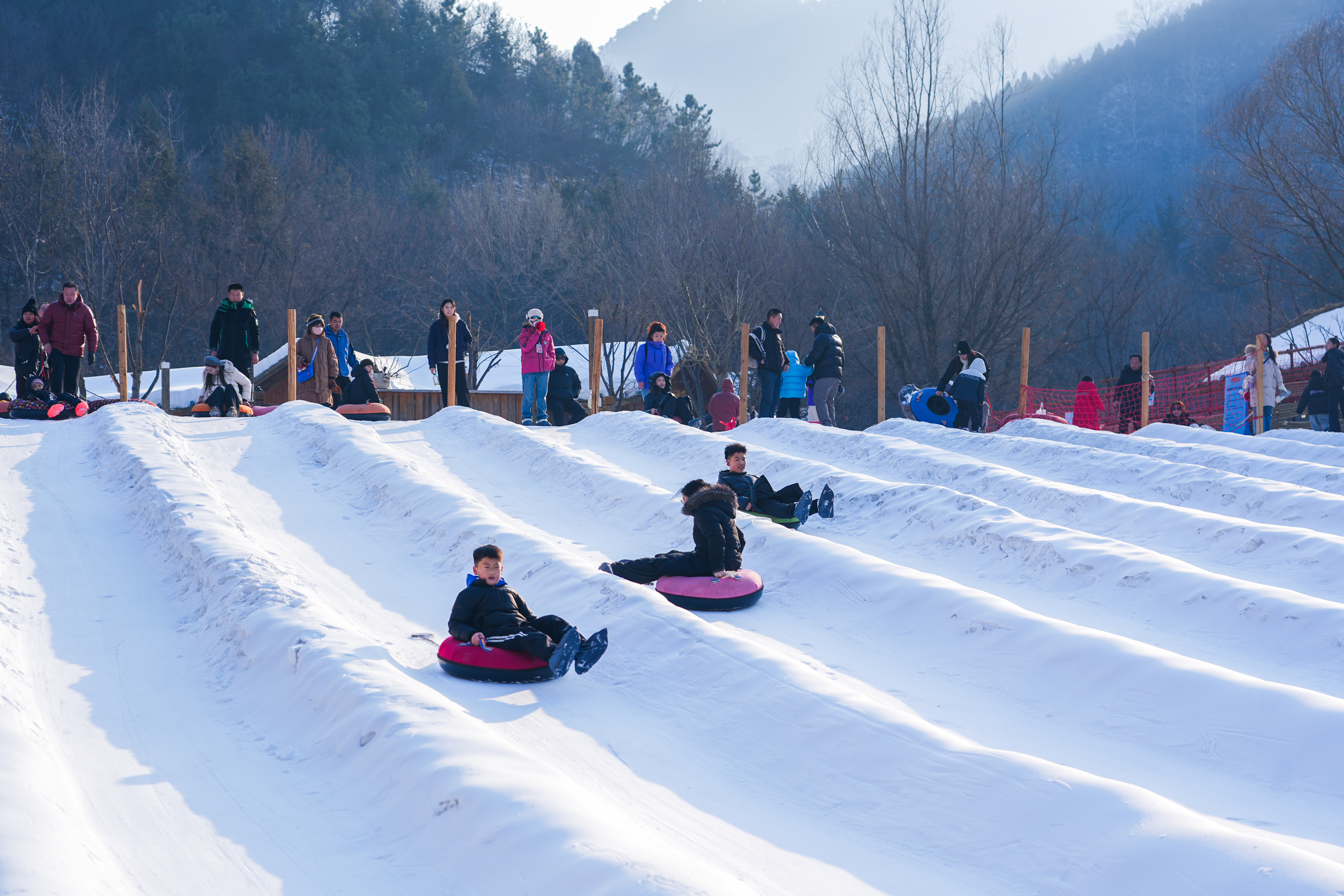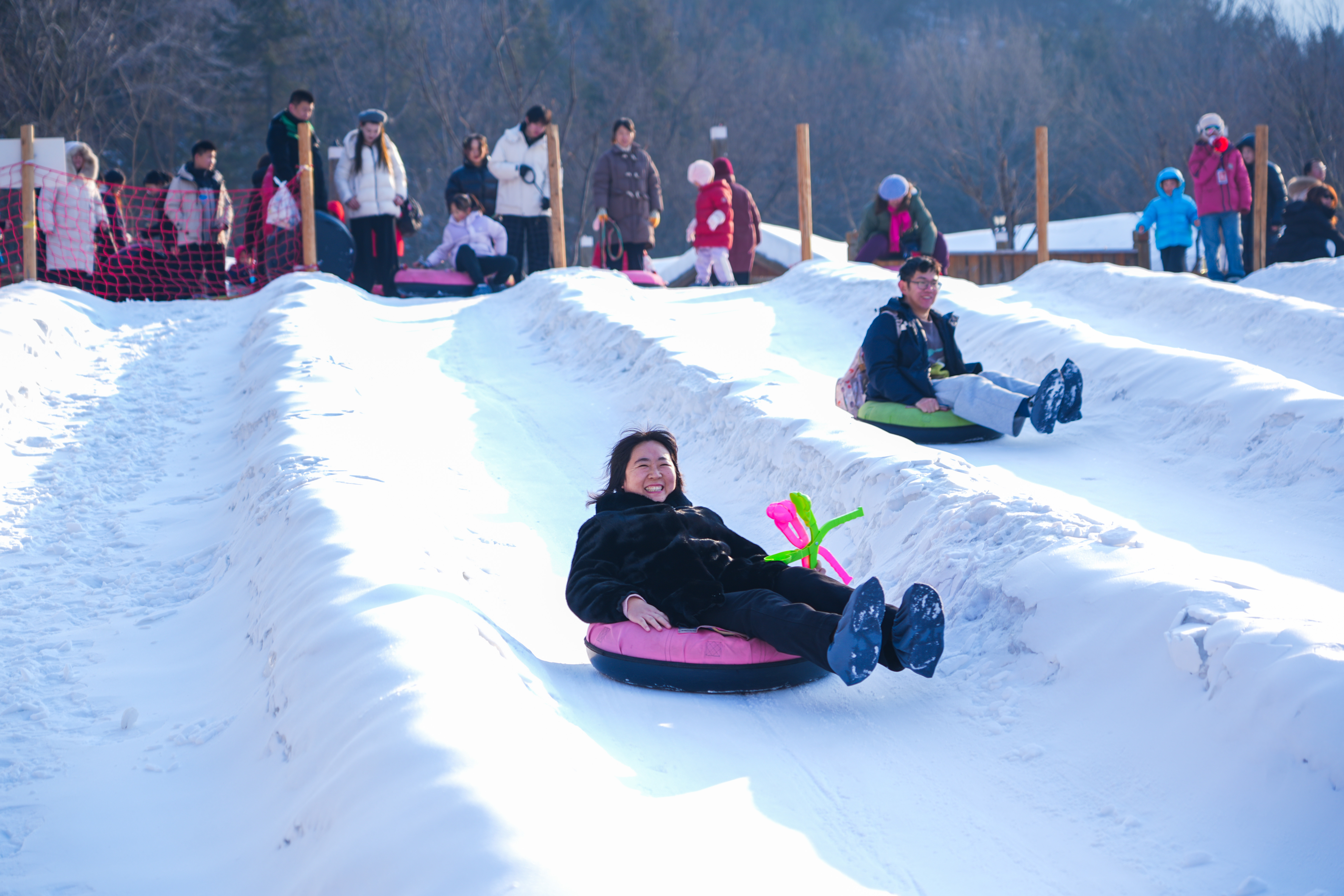 九如山将自然景观与互动体验深度融合,尤其适合寒假亲子家庭。户外冰雪乐园中,无动力滑冰车载满亲子时光,戏雪场内全家人乘滑雪圈疾驰而下,欢笑不断。冰上舞狮、趣味演出更将寒假春节氛围拉满,处处可见全家出动、笑脸洋溢的热闹场景。