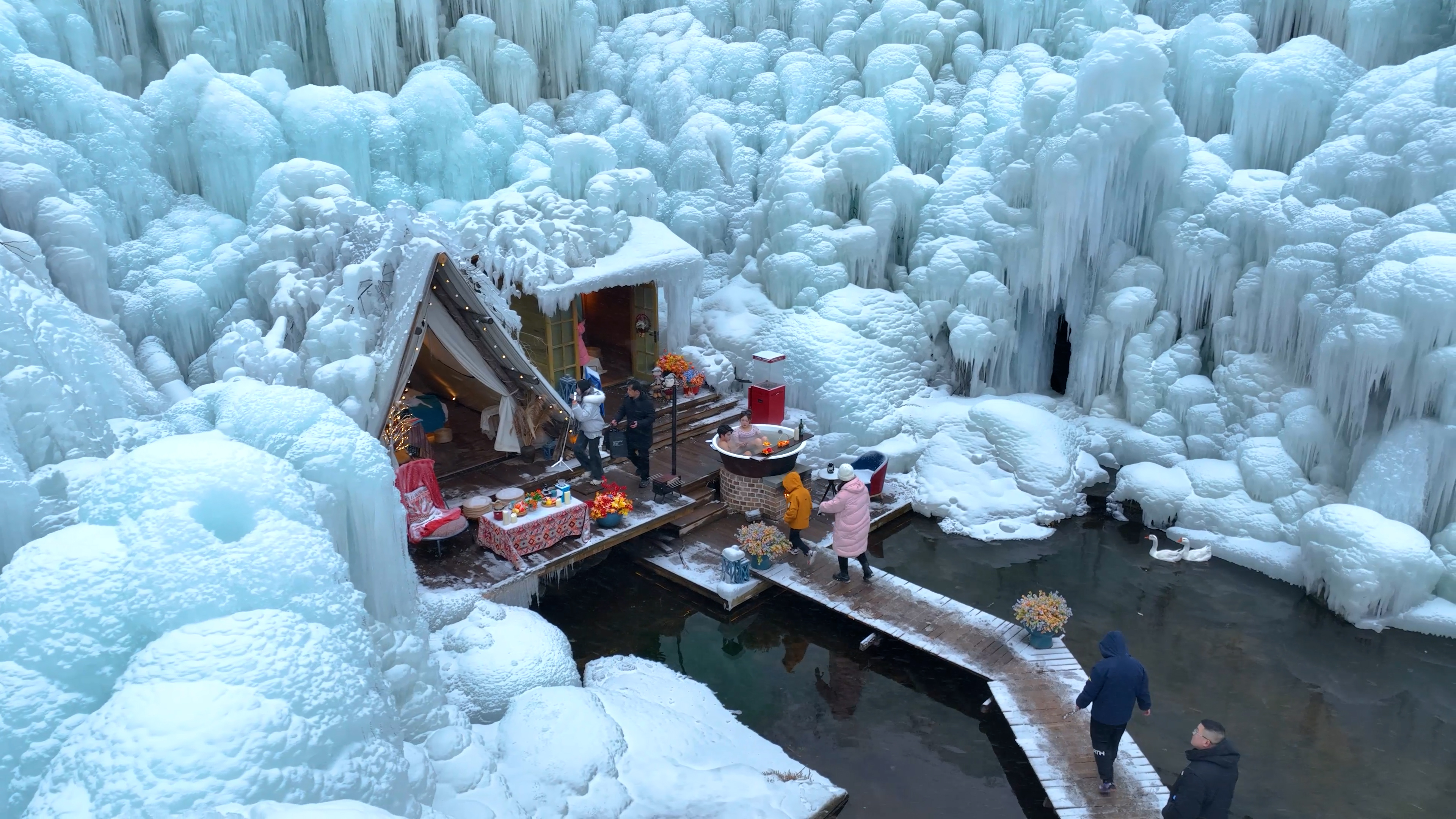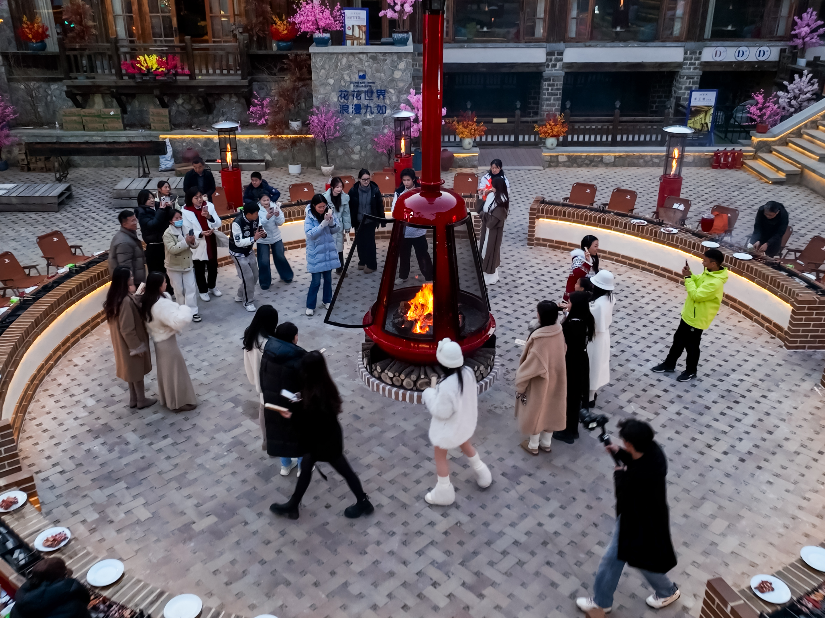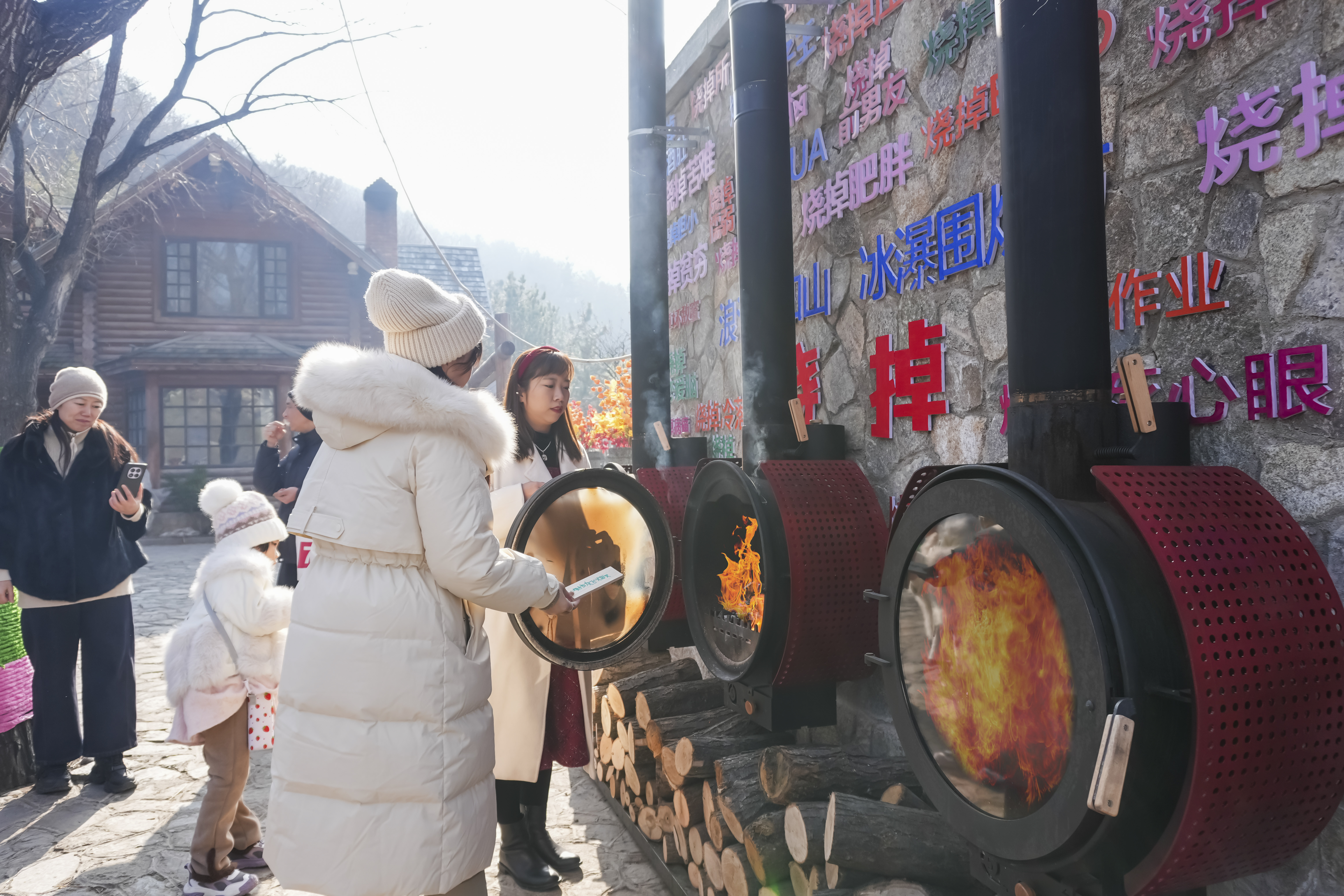 最令人惊艳的是“冰火交融”体验。园区布置上百处火炉,形成“几步一火炉、百米一木屋”的独特景致。赏完冰瀑,全家围坐火炉旁,煮茶烤食,暖黄火光映照笑脸,与户外冰天雪地形成奇妙对比。这里不仅是取暖处,更是亲情凝聚的角落,围炉闲话之间,尽显寒假团聚之乐。