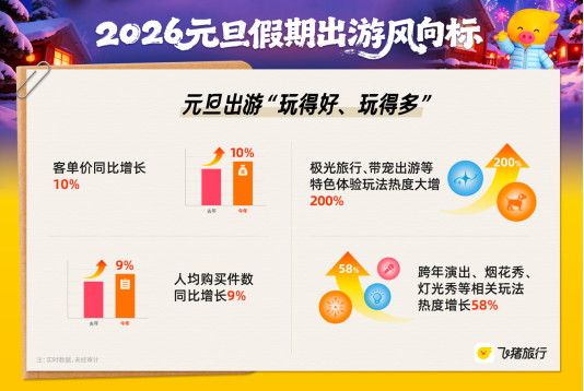 玩法上,游客对个性化体验与跨年仪式感的追求不断提升。飞猪数据显示,截至目前,极光旅行、宠物随行等特色体验类旅游玩法热度同比去年大增200%。此外,今年元旦的跨年氛围愈发浓厚,包括跨年演出、烟花秀、灯光秀等“跨年游”相关玩法的搜索游热度同比上涨了58%。