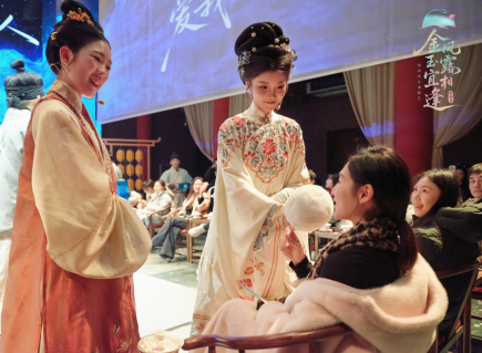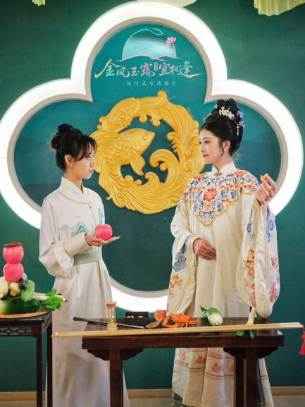 拿着“金元宝”坐上雅集尊位,品尝明湖居特制清茶酥点,为心仪的公子投票,赢完斗拐游戏、接下诗词接龙挑战,解鲁班锁、拼“煎饼卷一切”创意,还能和雨荷、龙公子唠嗑闲谈……在这场《金风玉露宜相逢》互动演艺中,游客不再是隔着帷幕看故事的旁观者,而是实打实走进“湖畔雨荷”世界的亲历者。