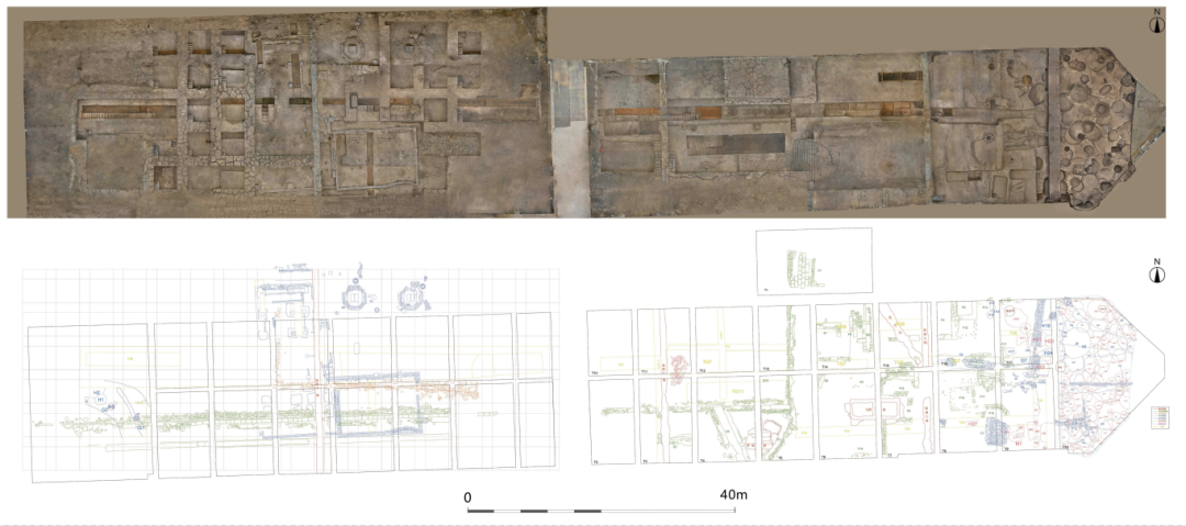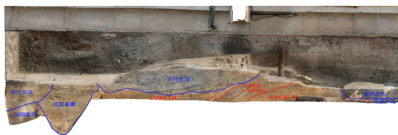 其中,最重要的是龙山文化城墙与壕沟的发现。城墙位于发掘区东端,南北长22.5 米且向区外延伸,宽约 28 米,残高约 6.4 米,人工堆筑而成。墙内出带纹饰蛋壳陶片,还发现一例人头骨,表明城墙建造过程中可能存在祭祀活动。城墙西侧壕沟利用自然河道改造,宽度超50米,堆积为交替叠压的淤沙层和淤泥层,底部淤沙层出土少量大汶口文化陶片,其上发现较多龙山文化陶片。