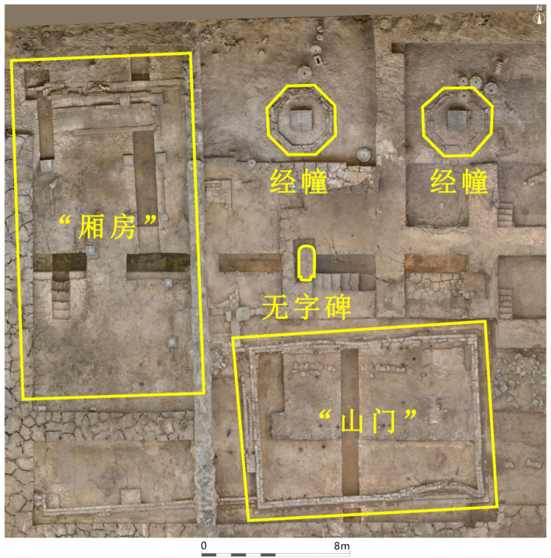 此外,发掘西区还发现了一座较大规模的宋代佛寺建筑基址,由山门、厢房和2组经幢组成。房址内发现4件精美石雕柱础,两经幢基座周边清理出13件精美佛教经幢石雕构件。