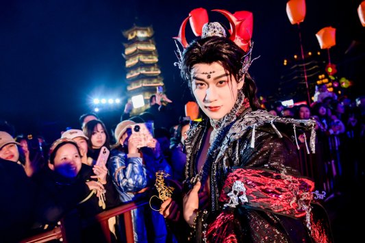 “天官祈愿妙会”惊艳开秀,成为灯会现场焦点。田峻彰、陈沐一等知名国风达人悉数亮相,身着天官赐福主题华服,衣袂翩跹、仙气十足,尽显中式国风浪漫。国风达人们不仅献上高能群舞表演,更领衔开启巡游狂欢,华服与花灯相映成趣,氛围感拉满。游客们纷纷加入互动,解锁银票、孔明灯等专属福利,沉浸式感受祈愿纳福的新春氛围,现场随手一拍皆是国风大片。