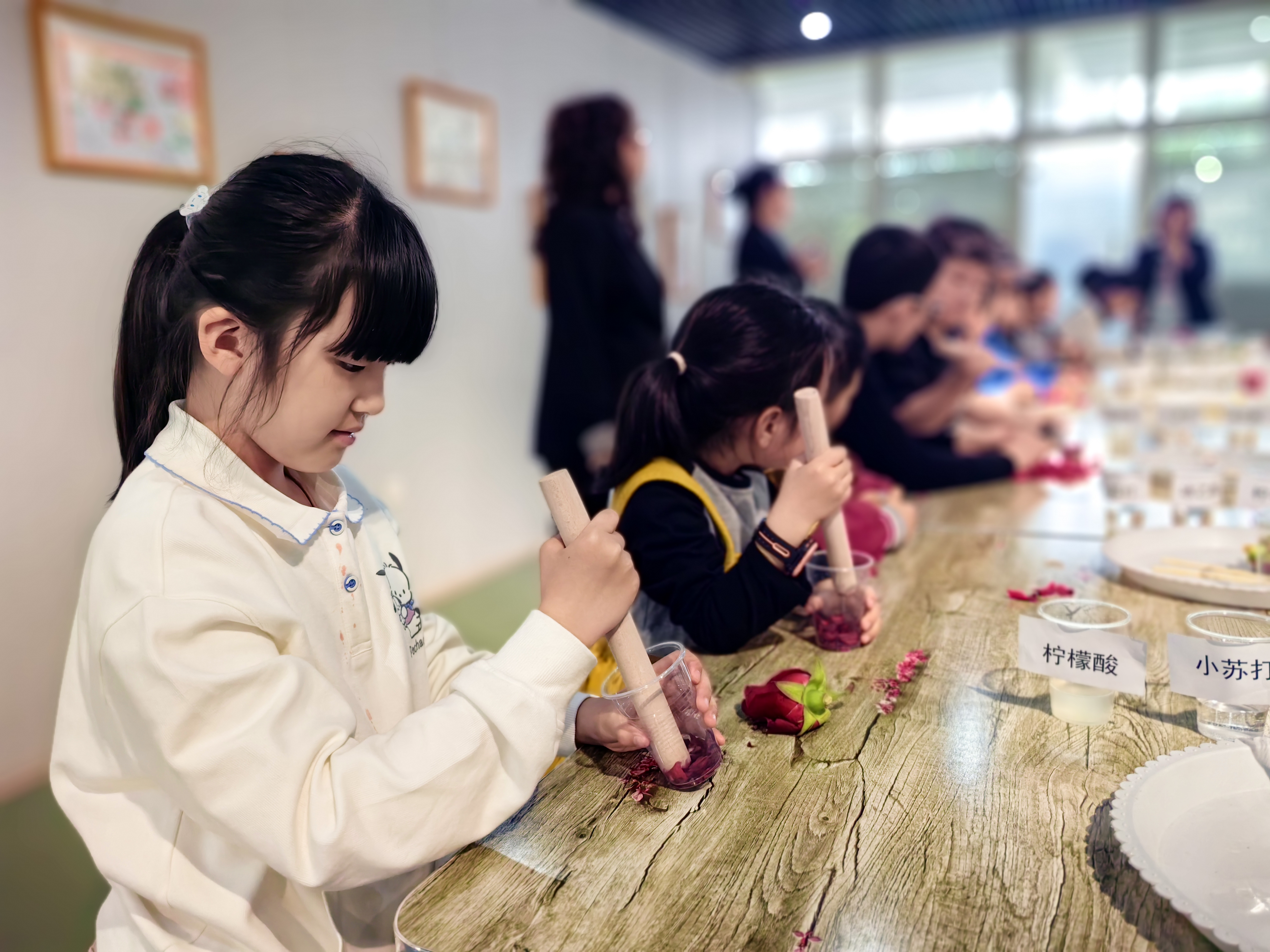 在科普馆,孩子们变身小小实验员,探索花青素的“变色魔法”。科普老师将花青素比作花朵的“隐形画笔”,用通俗易懂的语言讲解花色形成的科学原理,分步演示实验的操作流程。在老师手把手指导下,孩子们分组动手实践,亲眼见证花青素在不同条件下变换出缤纷色彩,直观揭开花朵五彩斑斓的秘密,在趣味实验中感受科学探索的独特魅力。